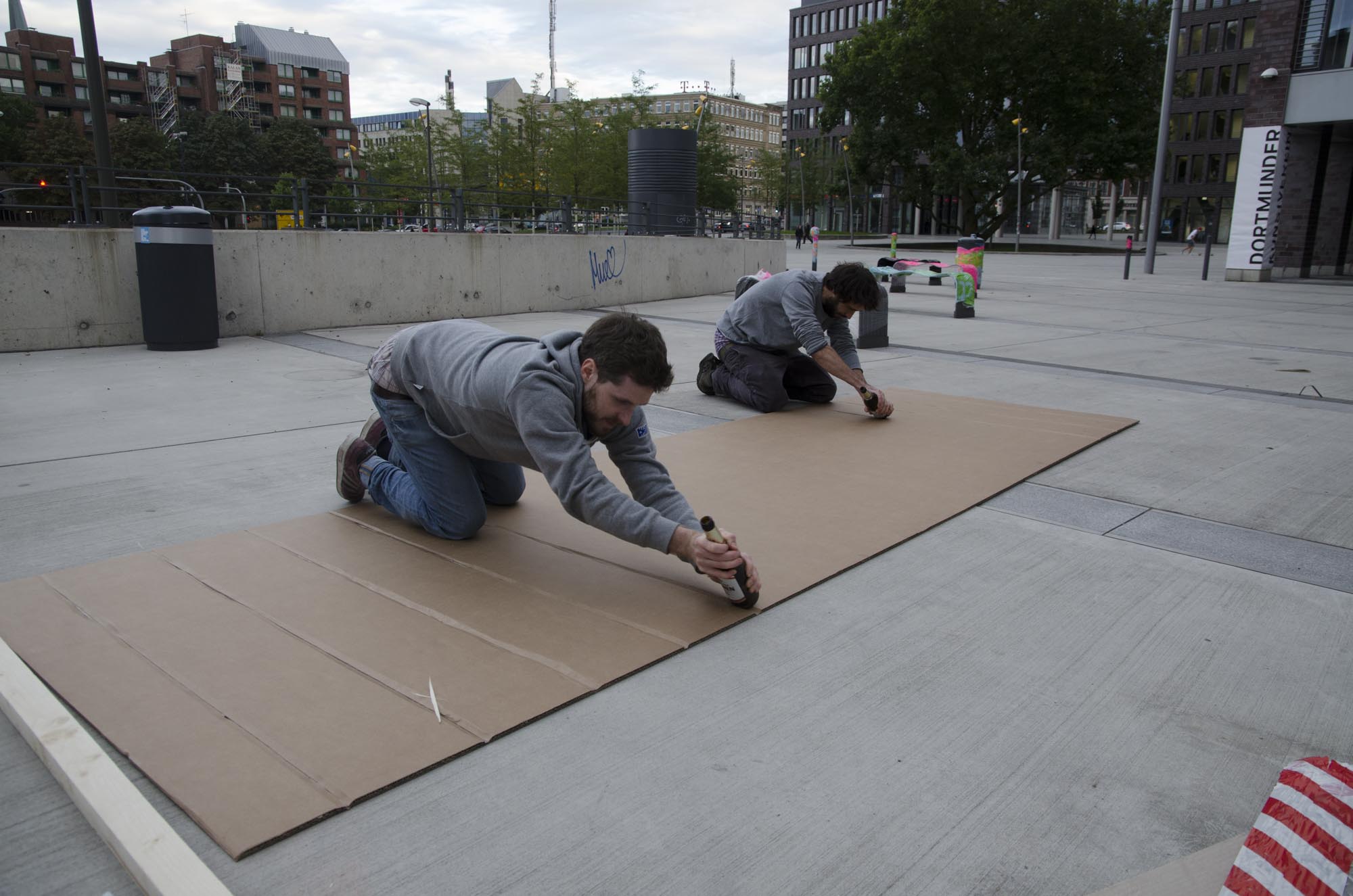 The many exciting workshops and projects regarding urban skills offered a chance to meet a bunch of nice people - despite the streaky weather. After the public preparation of the mock-container out of cardboard in the festival-tent in the first days, saturday went wild: old and young cooked, ate, drew, danced and laughed together with over 150 New-Dortmunders - in addition to the crowd of present visitors of the festival, the night of the museums and others, who followed our invitation.