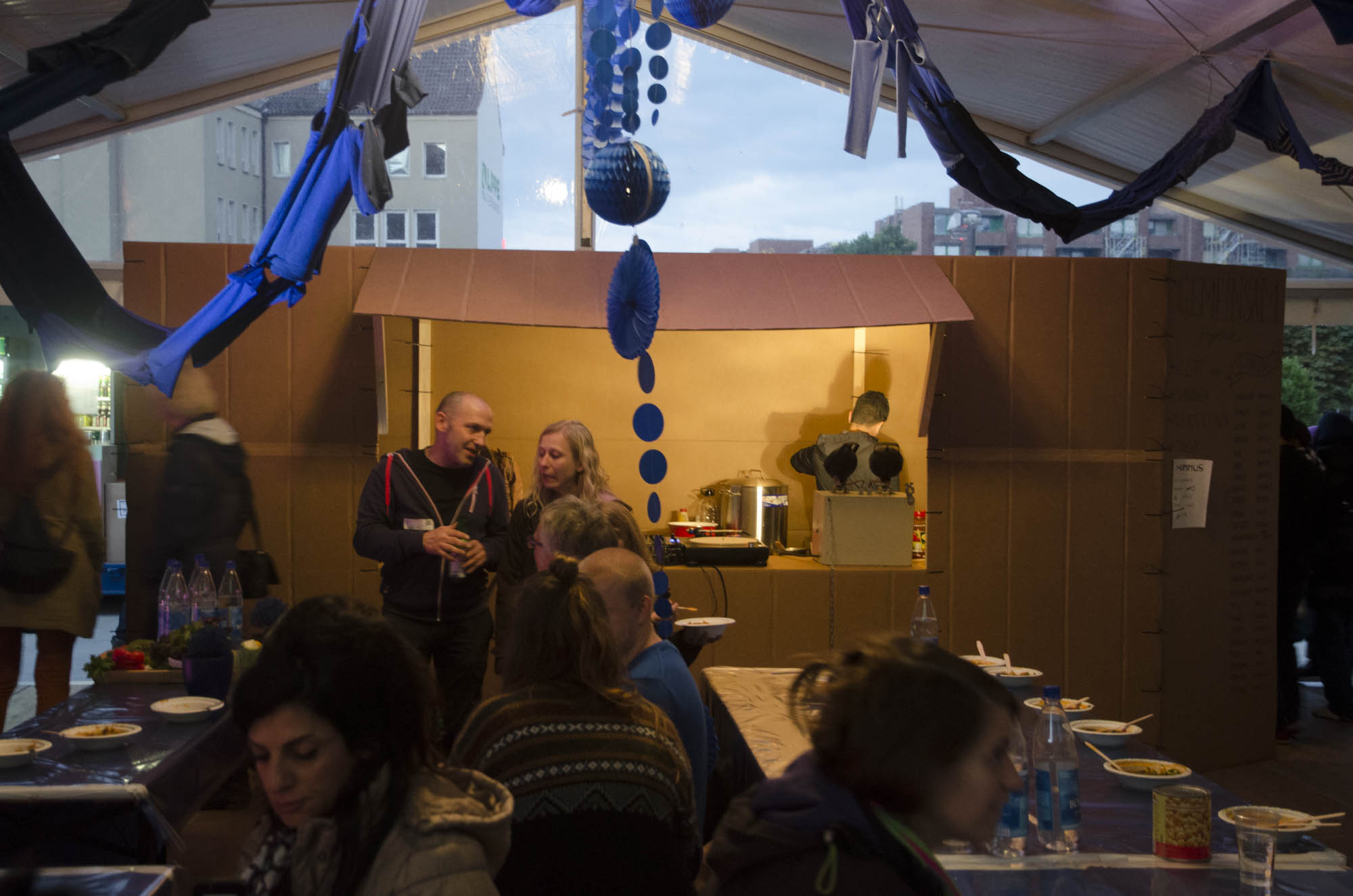 Neben einer Menge spannender Workshops und Projekte zu urbanen Fertigkeiten trafen wir auf viele nette Menschen - trotz des durchwachsenen Wetters. Nach der öffentlichen Vorbereitung des Mock-Containers aus Pappe im Festival-Zelt an den ersten Tagen ging es am Samstag rund: Groß und klein kochten, aßen, malten, tanzten und lachten gemeinsam mit über 150 Neu-Dortmundern. Hinzu kamen die zahlreichen anwesenden Besucher des Festivals, der Nacht der Museen und andere, die unserer Einladung gefolgt sind.