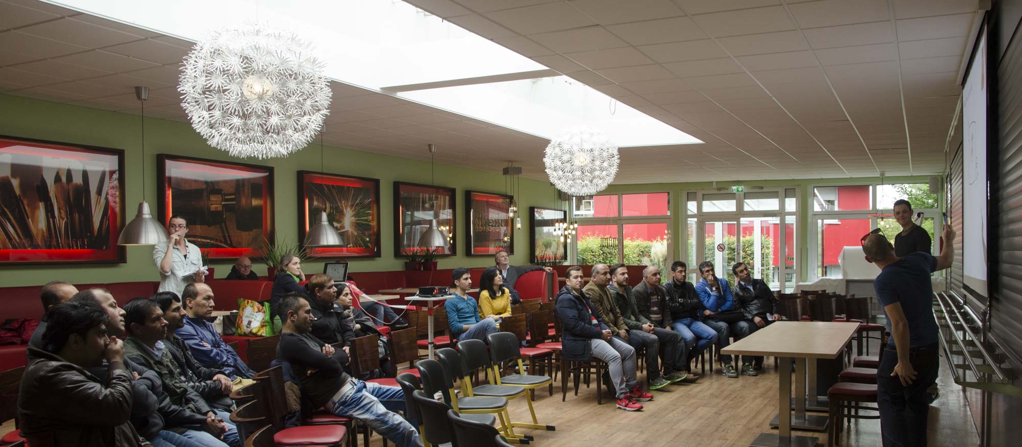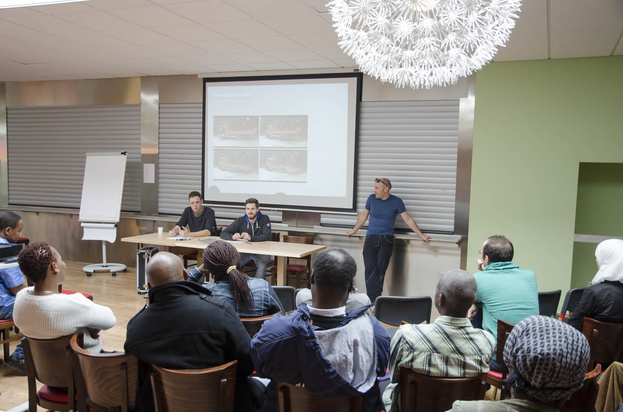 24.09.15Eine weitere Kennenlern- und Vorstellungsrunde mit Neu-Oberhausenern die sich über die Teilnahme an Entwurf und Bau der Refugees' Kitchen informieren wollten fand heute in den Räumlichkeiten der AWO Oberhausen statt. Vor ungefähr 60 Interessierten unterschiedlichster Herkünfte und Gewerke präsentierten wir das Konzept der mobilen Küche, beantworteten etwaige Rückfragen und führten ungezwungene Gespräche in denen wir zahlreiche "Bewerbungen" zur Bildung der Baugruppe entgegennahmen.